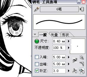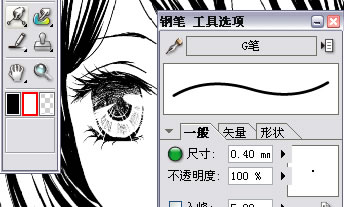 | 5.眼睛的绘制。本期教程的第一个小重点来了,眼睛的绘制。 每个人画眼睛的习惯不同,样子也会有很大的差别,这里我仅仅教大家一种很简单的方法,希望能对大家有所帮助。首先找出瞳孔,把笔触放轻,根据个人喜好选择适合的笔头,我习惯用G笔。在阴影位置画深一些,线条密些,浅色部位用发散状的线条画。数位板的压感不是很好或者手上力度把握不到位的朋友,可以把笔头的尺寸调小些再画。我的板子压感表现还不错,轻轻画的时候依然可以画出很细的线条,所以就没有调整笔头的大小。暂时不要考虑眼睛的光点问题,先把基本的轮廓画出来,睫毛不要画得太死。