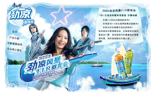 在世界大多数地区,蓝色代表男性。在中国,蓝色代表小女孩。在西方的婚俗中,蓝色代表爱情。在伊朗,蓝色是丧服的色彩。在世界范围内,蓝色是最容易被大众接受的色彩。 3.4.5.5 实例说明 如图3-40所示,为康师傅劲凉风暴FIR歌友会网站(http://icetea.allyes.com/)网页截图,整个页面使用蓝色作为主色调,给人以清爽、时尚的感受。  图3-40 康师傅劲凉风暴FIR歌友会网站网页截图