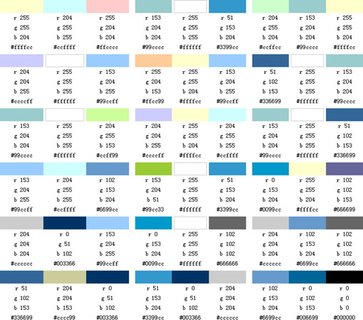 如果在蓝色中分别加入少量的红、黄、黑、橙、白等色,均不会对蓝色的性格构成较明显的影响力。如果在蓝色中黄的成份较多,其性格趋于甜美、亮丽、芳香。在蓝色中混入小量的白,可使橙色的知觉趋于焦躁、无力。  图3-41 蓝色系配色方案