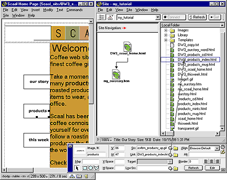 用户可以了解到 Dreamweaver 创建链接的方法有好几种。首先,用户用属性面板将 Our Story 图像添加链接,链向 Our Story 页面。