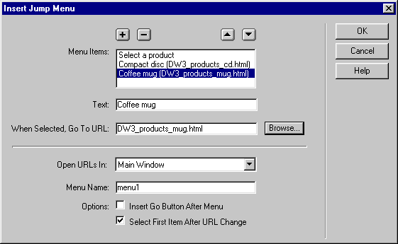 10 | 在 Text 填框内,填上 Coffee mug。点击 Browse,找到 DW3_products_mug.html。点击 Select (Windows) 或 Choose (Macintosh),选取当该项目被选中后要打开的文件。 |