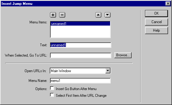 3 | 将插入点置于表格单元之内,选择 Insert > Form Object > Jump Menu。 |