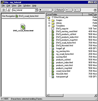 站点窗这时会以两种形式显示本地站点:左边窗口是一个站点地图,以图形方式显示 Scaal 站点(主页是 DW3_scaal_home.html 文件)当前的结构,右边窗口是本地站点文件夹内容列表。