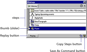 历史面板上显示的是自从你创建或打开当前激活文档之后对该文档所有的操作步骤记录。(历史面板不显示你在其它帧,其它文档窗,或者站点窗中所执行的操作。)历史面板允许你同时撤销一个或多个过往操作步骤;还允许你重复过往操作步骤,以及创建新的命令来自动执行重复操作的任务。
