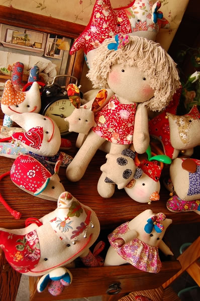 心情很好的日子,在草稿本上涂鸦,从一堆线条中找出那个最淘气的形象,拿几块布描描剪剪,不要说话,一定要一气呵成…… 这就是鸡蛋花花做手工的过程。 我认识鸡蛋花花的时候,她正怀着宝宝,因为宝宝属鸡,她希望亲自做一个布偶给他,于是拿起了久违的针线,开始了布偶创作……那时候,鸡蛋花花甚至没有看过任何手工书,完全依靠感觉设计,却成就了属于自己的独特风格——将中国传统的元素提炼出来,用现代的时尚方式去表达。 现在,宝宝快4岁了,鸡蛋花花已经不仅仅是她的网名,而成为一个拼布品牌。从第一个作品诞生,到在台湾和北京拥有专卖店,只用了3年,这多少是一件神奇的事。 我们每次在网上交谈都很愉快,但只要宝宝有什么需要,花花就会飞快地离开电脑。因为她最重要的角色是妈妈,宝宝是灵感之源,爱他的感情成就了好多可爱的布偶。有趣的是,花花的妈妈也是一位传统手工高手,有时候花花只需要想象,妈妈就能完美地呈现出作品,是花花心中的魔法师!现在,花花又成了儿子眼中的魔法师——这是另一件神奇的事。